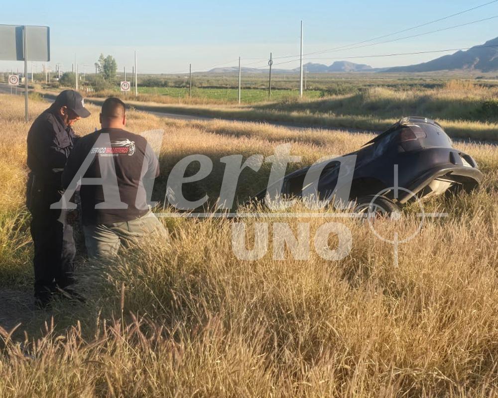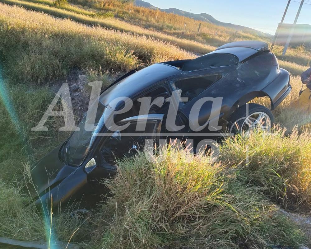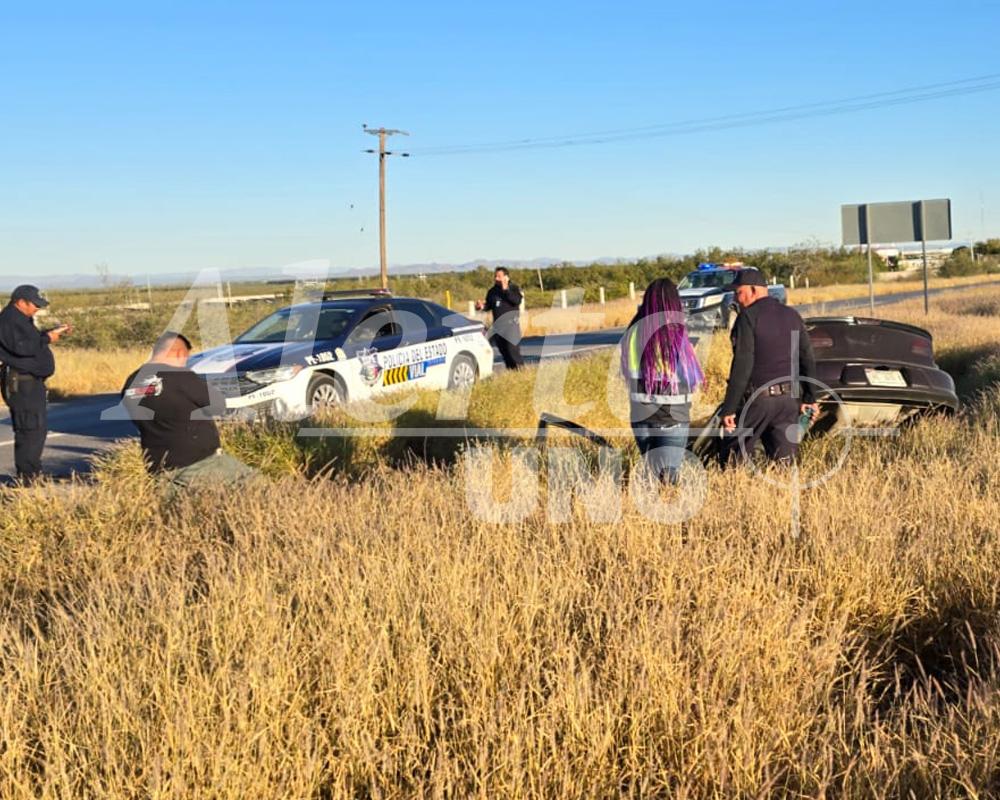 Un violento accidente dejó esta tarde a un conductor al borde del peligro en la carretera federal 45, entre Meoqui y Chihuahua. Un Chevrolet morado salió disparado del camino y terminó volcado en un profundo hoyanco, mientras los transeúntes y automovilistas que presenciaron el siniestro no podían creer la magnitud del impacto. Las bolsas de aire del vehículo se activaron violentamente, protegiendo parcialmente al tripulante, quien quedó con una herida sangrante en la frente.