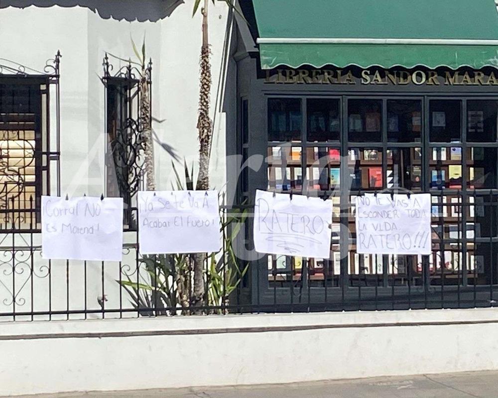 Gritos, pancartas y consignas marcaron la protesta de militantes de Morena a las afueras de la librería Sándor Márai, donde exigieron al senador Javier Corral Jurado que diera la cara y abandonara el lugar.