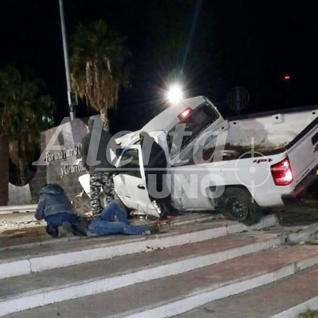 Severos daños materiales dejó un accidente vial registrado la madrugada de este jueves, luego de que una camioneta tipo pick-up se impactara y terminara sobre la glorieta Gómez Morín, afectando parte de su estructura de concreto.