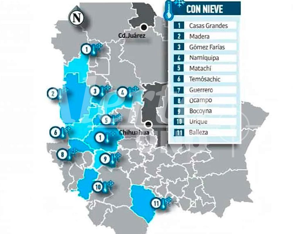 El coordinador estatal, Luis Corral Torresdey, explicó que los municipios donde se registró caída de nieve fueron Casas Grandes, Guerrero, Madera, Ocampo, Temósachic, Gómez Farías, Namiquipa, Matachí, Bocoyna, Urique y Balleza, con acumulaciones de ligeras a moderadas, especialmente en zonas altas y tramos carreteros de la sierra.