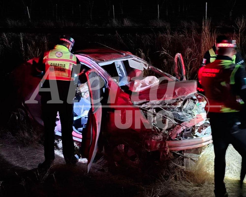 Chihuahua, Chih.– Un fuerte accidente se registró en el kilómetro 43 de la carretera que conecta Chihuahua con Ciudad Juárez, cuando el conductor de un Chevrolet Beat rojo perdió el control del vehículo y salió de la vía, provocando una aparatosa volcadura.