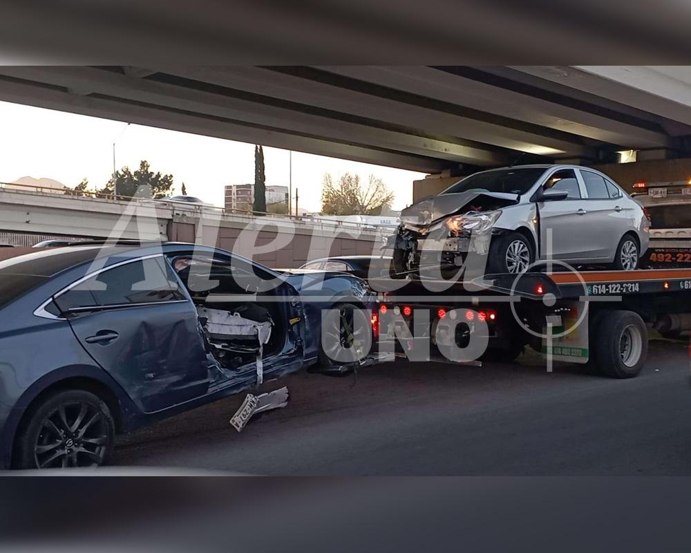 El accidente ocurrió en el cruce con el Canal Teófilo Borunda y la Avenida de las Industrias, donde la maniobra imprudente del Mazda desató la colisión de gran intensidad. Los daños en ambos vehículos fueron evidentes tras el fuerte golpe.
