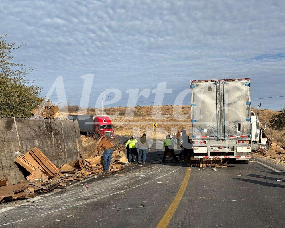 Dos tráileres se estrellaron de frente en la carretera libre a Juárez, dejando un aparatoso escenario con una unidad volcada y toneladas de cartón regadas sobre el asfalto.