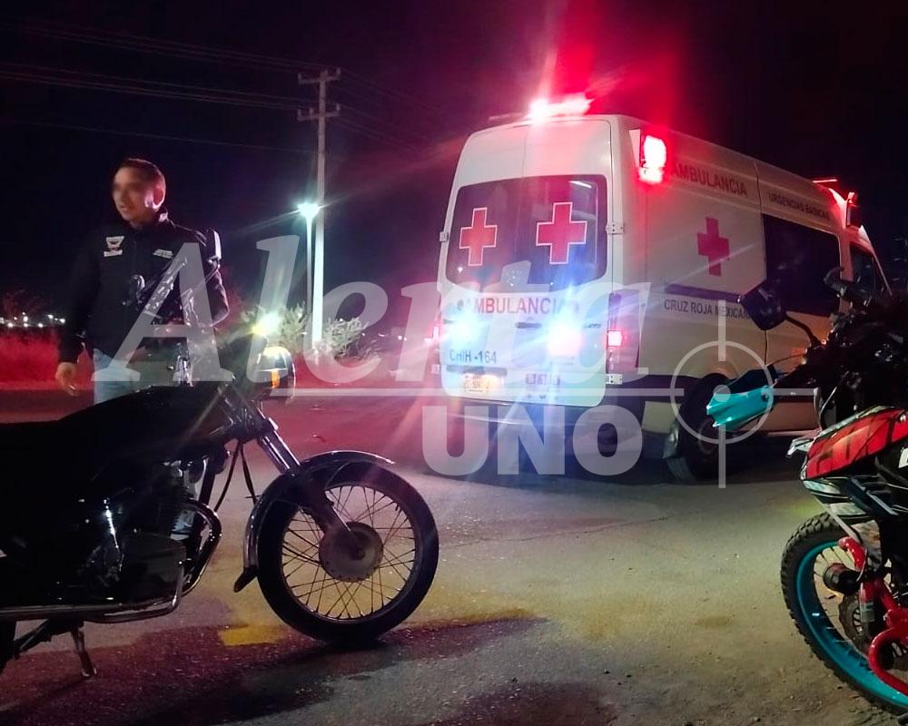 Delicias, Chih.- La noche de este jueves se registró un accidente en la Calzada del Charro, en el sector oriente de la ciudad, que involucró a un motociclista y un automóvil Chevrolet azul.