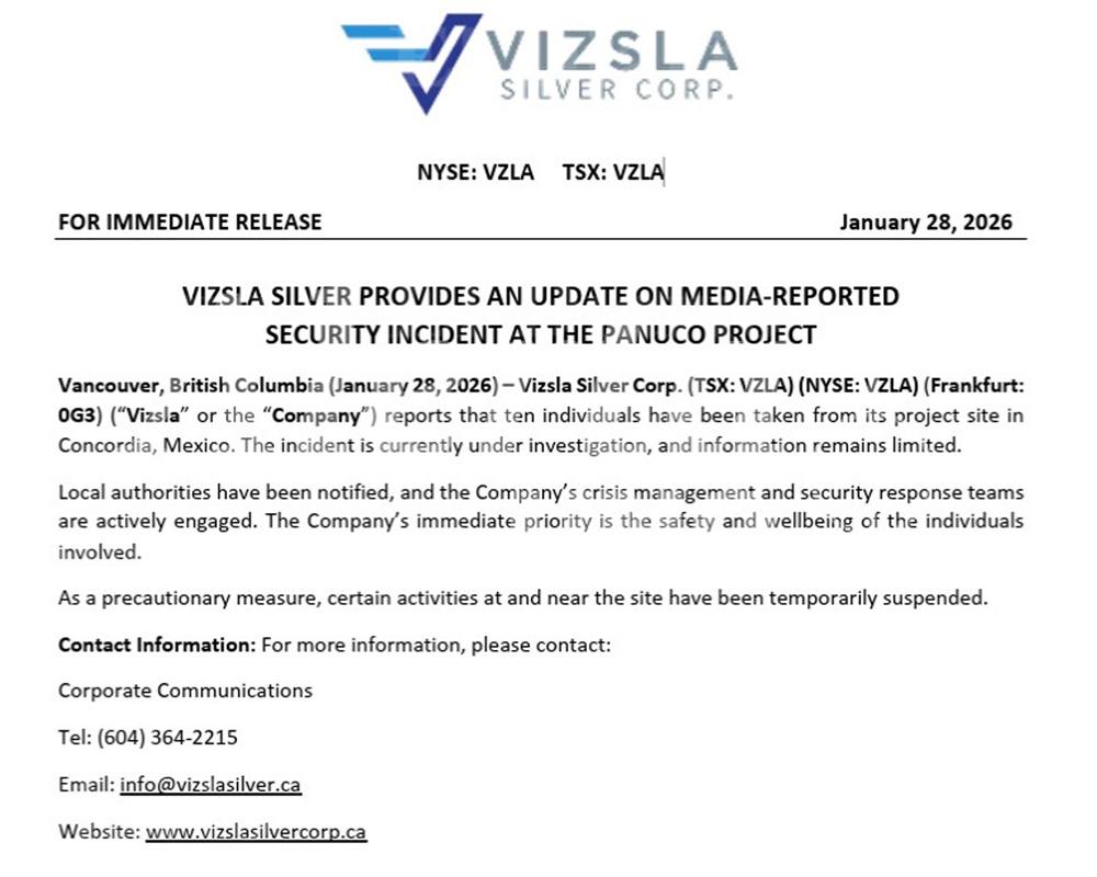 La incertidumbre continúa tras el secuestro de diez personas relacionadas con Vizsla Silver Corp., hecho que obligó a la empresa a suspender actividades en Concordia, Sinaloa, ante el riesgo que persiste en la zona. La compañía aseguró que su prioridad es la seguridad de los trabajadores y sus familias.