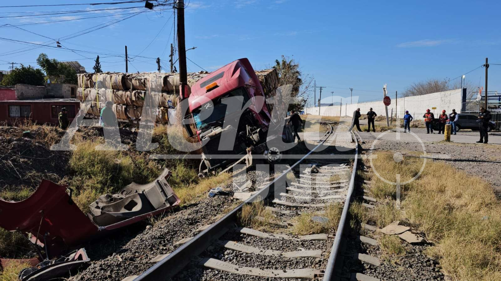 Un tráiler quedó atravesado sobre las vías del tren en la calle 57, frente a la Papelera de Chihuahua, tras sufrir una falla mecánica que derivó en un accidente con la locomotora.