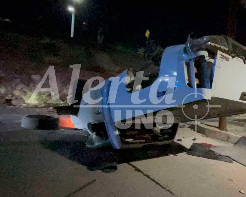 Chihuahua.- Un conductor que transitaba de sur a norte a bordo de una camioneta GMC Sierra perdió el control del vehículo y terminó volcando sobre la lateral de la avenida Pacheco, en el cruce con Hermanos Ruiz.