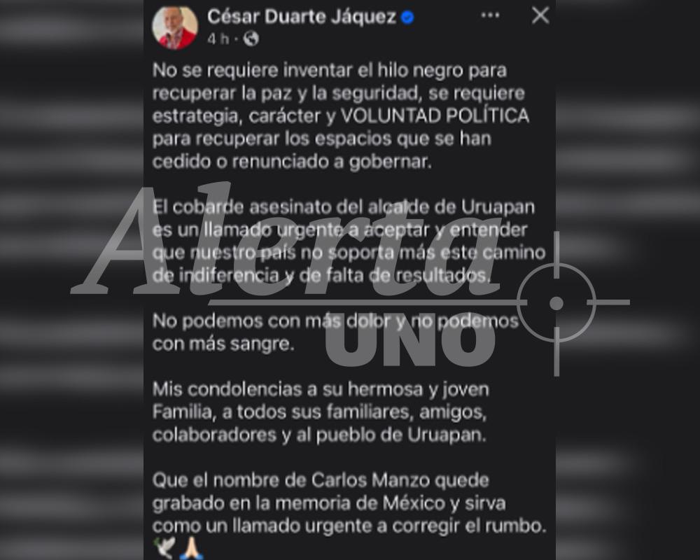 Duarte recordó los años más oscuros de inseguridad en Chihuahua y presumió haber devuelto la paz durante su mandato, “la misma que —según él— se perdió con la llegada de Javier Corral”. En su publicación, el exmandatario lanzó una crítica directa a las autoridades actuales: “No se requiere inventar el hilo negro para recuperar la paz, se requiere carácter y decisión”. Sus palabras resonaron en medio de la indignación nacional por el asesinato del edil michoacano, quien contaba con protección federal de 14 elementos.