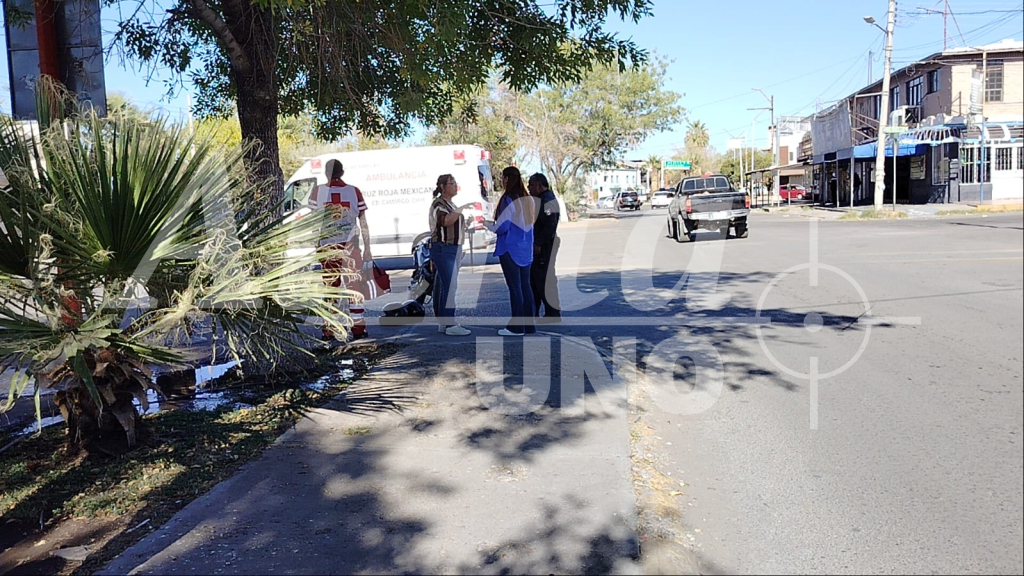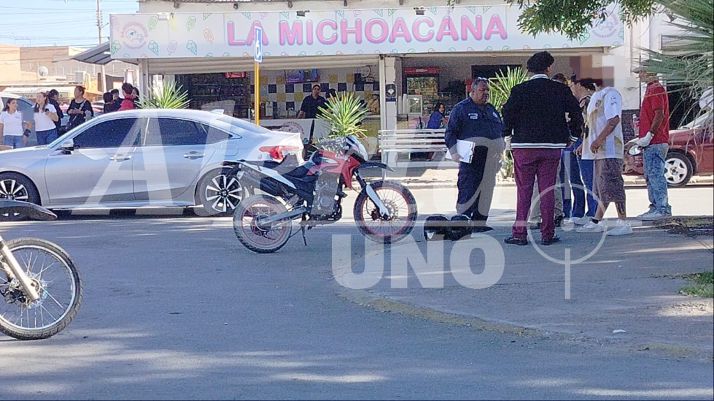 Delicias.- Tremendo susto (y un buen chisme) se armó esta tarde frente a la secundaria Leyes de Reforma, cuando una moto negra con rojo se estampó contra una camioneta Ford azul en pleno crucero de la Agricultura y Primera Norte.