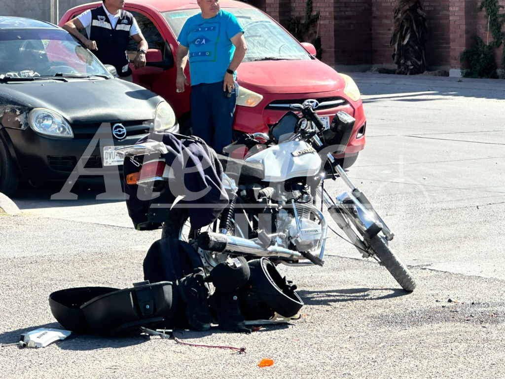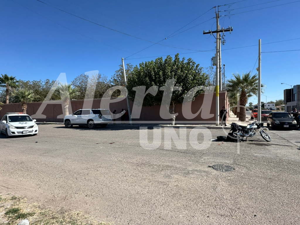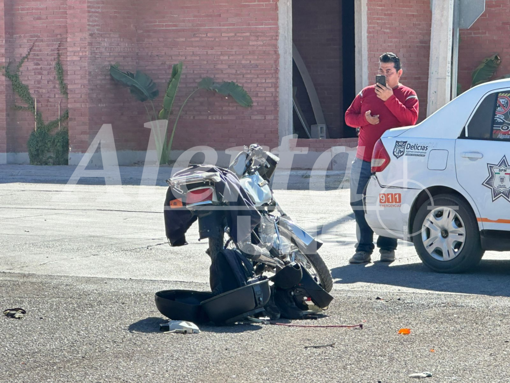 Un fuerte accidente vial se registró la tarde de este sábado en la intersección de la avenida 16 y la calle 10, al sur de Delicias, donde un motociclista resultó lesionado tras chocar contra otro vehículo.