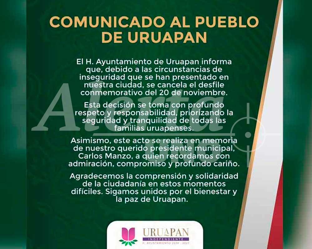 Cabe recordar que el desfile del 16 de septiembre también fue cancelado por instrucción del entonces alcalde Carlos Manzo Rodríguez, luego de un ataque armado contra policías municipales ocurrido la noche anterior.