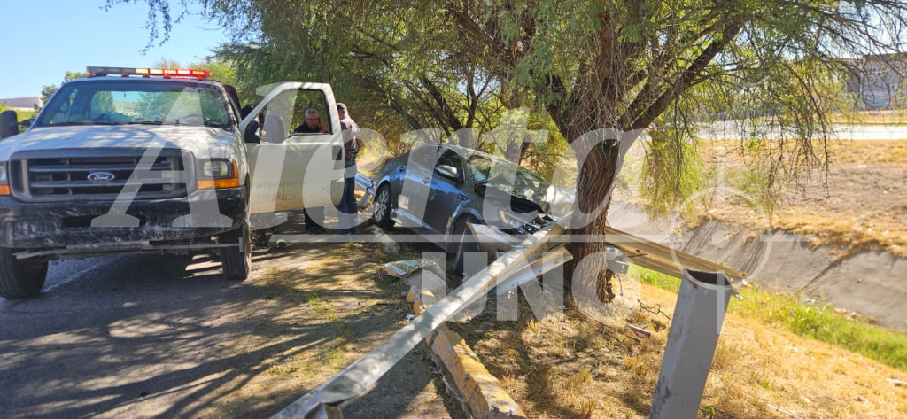 El percance se registró en la curva que conecta la avenida 26 con la calle 3a, cuando el conductor de un KIA Óptima 2014, gris, con placas del estado de Chihuahua, perdió el control por razones que se investigan, impactando primero la contención y posteriormente un árbol.