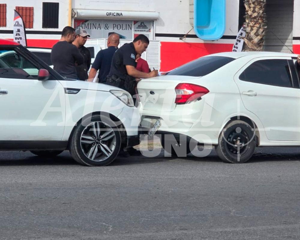 Agentes de la Policía Vial acudieron al sitio para elaborar el reporte correspondiente tras el impacto entre dos autos particulares: un Kia compacto y un Ford Figo, ambos con tonalidades similares.