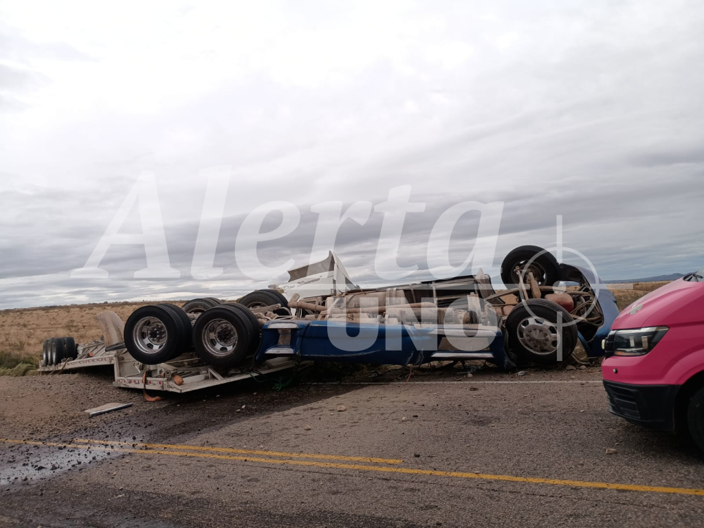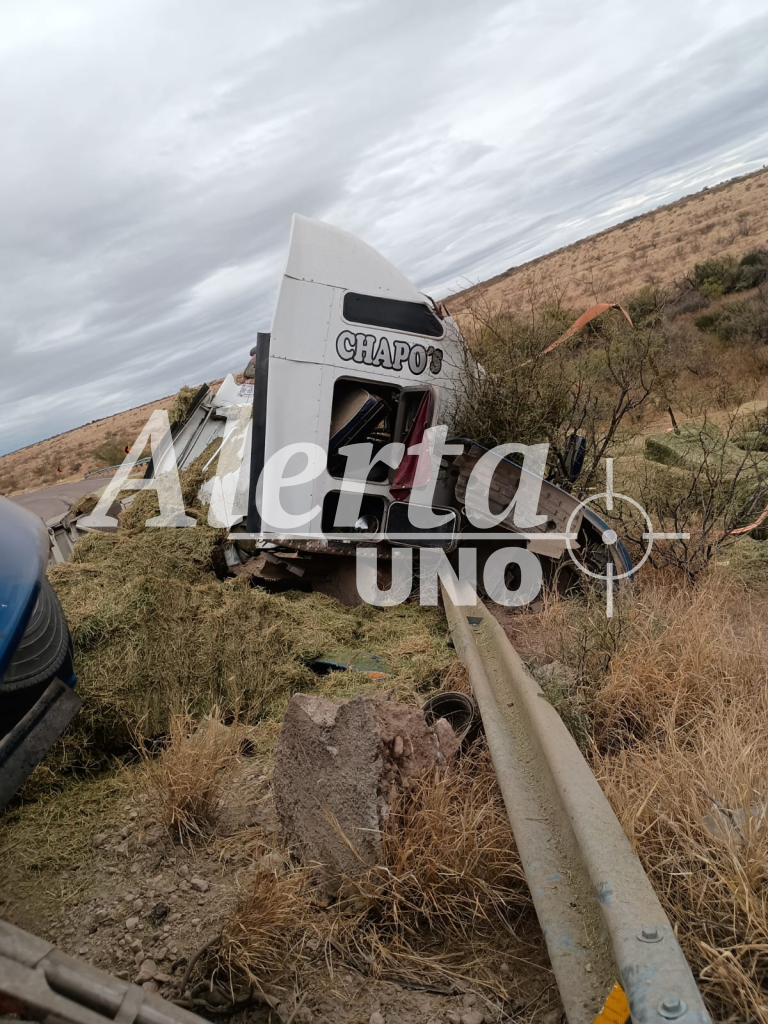 Un tráiler que transportaba pacas de alfalfa se accidentó este viernes en la carretera Delicias–Satevó, a la altura del kilómetro 12, lo que generó una fuerte movilización de los cuerpos de auxilio.