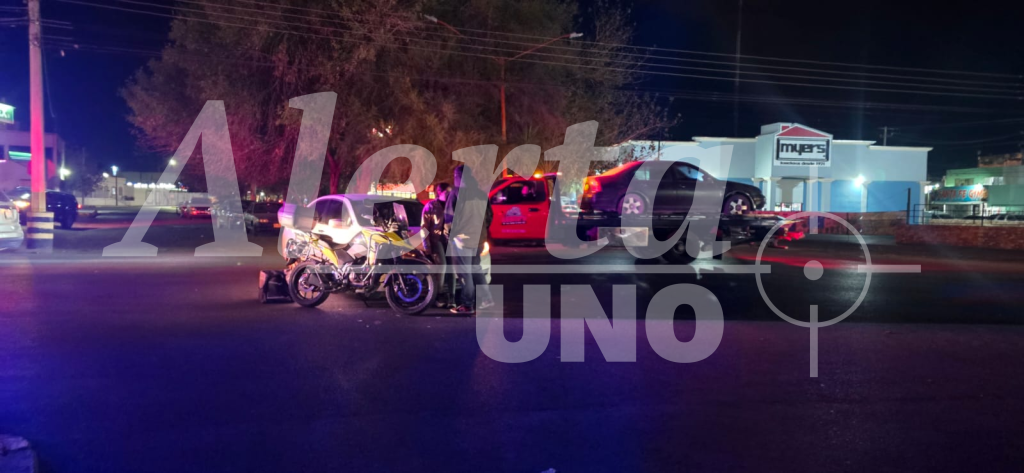 Este viernes por la noche se registró un choque entre una motocicleta y un vehículo particular en la intersección de avenida Agricultura y Calle 2a, al norte de la ciudad, frente a Heladerías Trebly.