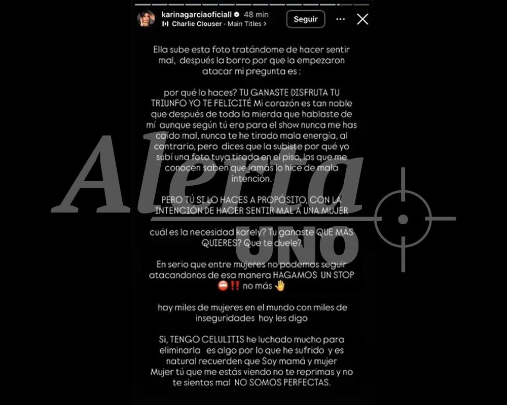 En sus historias, Karina fue aún más clara sobre lo que sentía: “Mi corazón es tan noble que después de toda la mierda que hablaste de mí, yo te felicité. Nunca me has caído mal, nunca te he tirado mala energía. Pero tú sí lo haces a propósito, con la intención de hacer sentir mal a una mujer”.