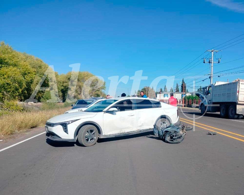 Un hombre resultó lesionado tras un fuerte choque entre su motocicleta y un vehículo particular en el tramo carretero que conecta Delicias con Rosales, a la altura de la Facultad de Ciencias Agrícolas y Forestales. El accidente ocurrió en el carril de Oriente a Poniente, cuando el motociclista, a bordo de una Itálica gris con verde, fue impactado por un vehículo KN de reciente modelo, quedando tendido sobre el asfalto.